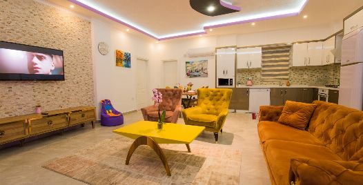 Salon : Salonumuzda oturma grubu, LCD TV, klima, sehpa bulunmaktadır. Havuz terasına çıkış yapılabilmektedir.