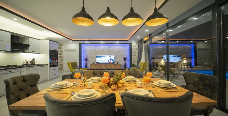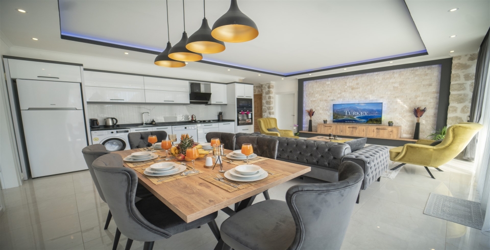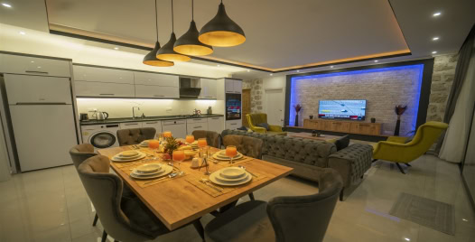 Salon : Salonunda konforlu oturma grubu, klima, TV, internet, uydu alıcı, yemek masası, sehpa bulunmaktadır.