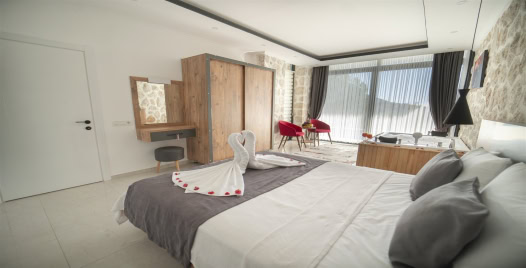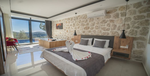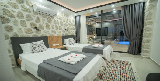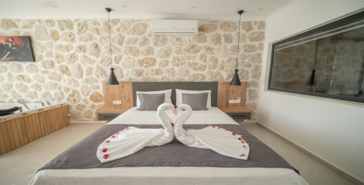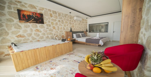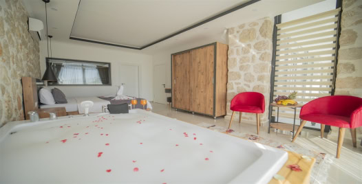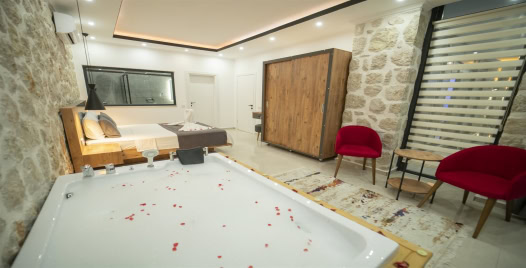 1. Yatak Odası : Çift kişilik yatak, klima, komodin, jakuzi elbise dolabı, makyaj masası banyo ve tuvalet bulunmaktadır.