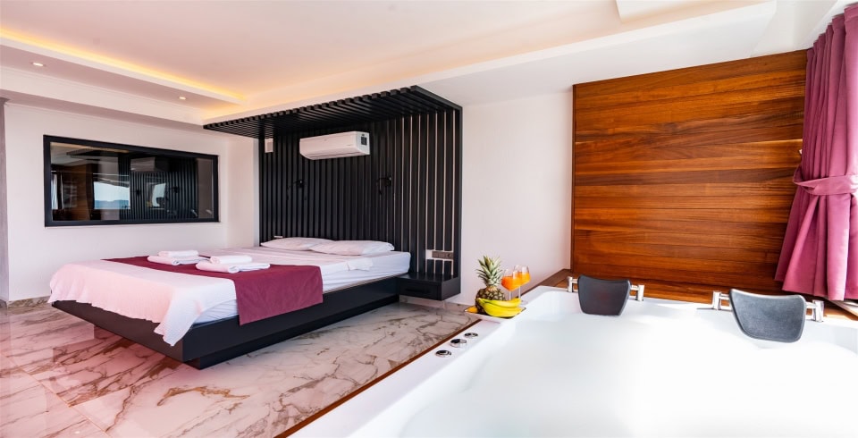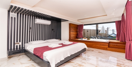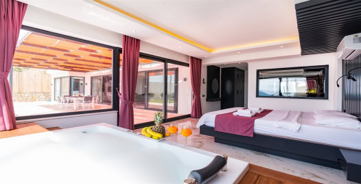 1.Yatak Odası: 1 adet çift kişilik yatak, komodin, elbise dolabı, jakuzi, banyo ve lavabo bulunmaktadır.