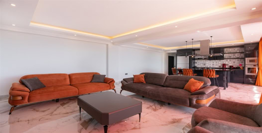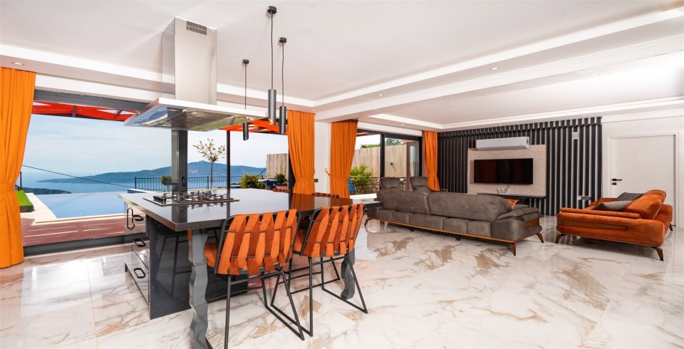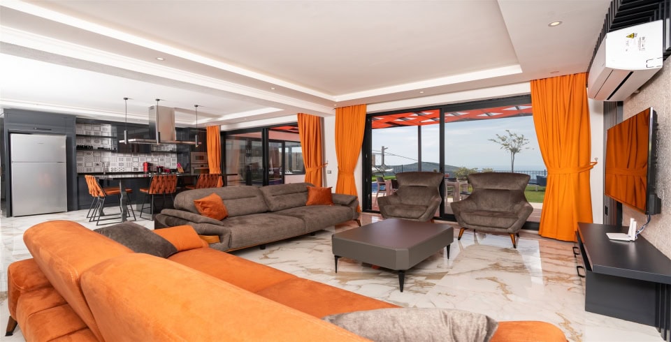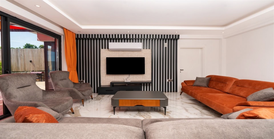 Salon : Konforlu oturma grubu, TV, TV ünitesi, orta sehpa, klima, havuz terasına çıkış bulunmaktadır.