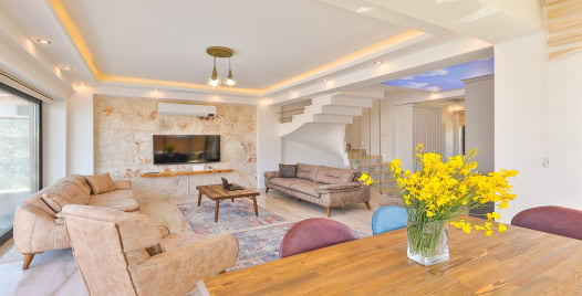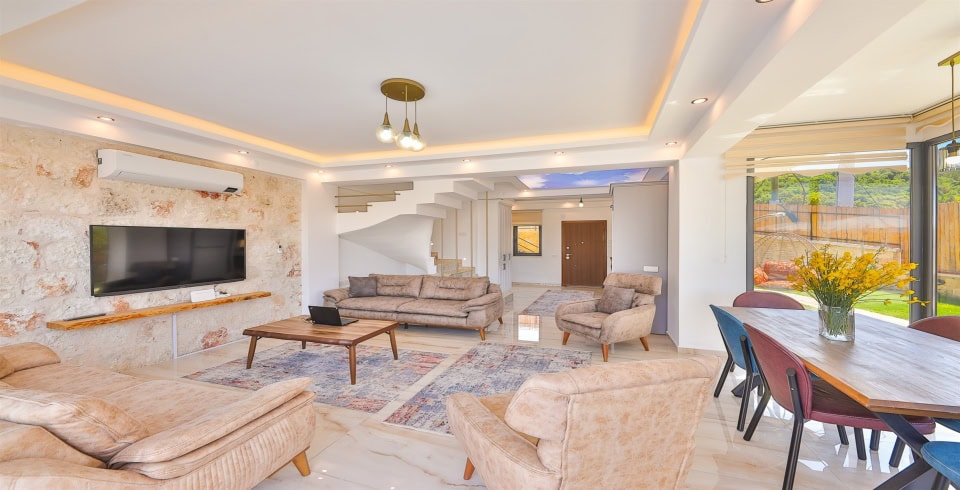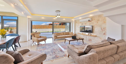 Salon : Villa salonunda oturma grubu, TV, internet, klima, sehpa bulunmaktadır.