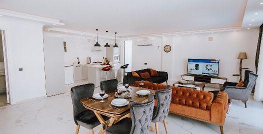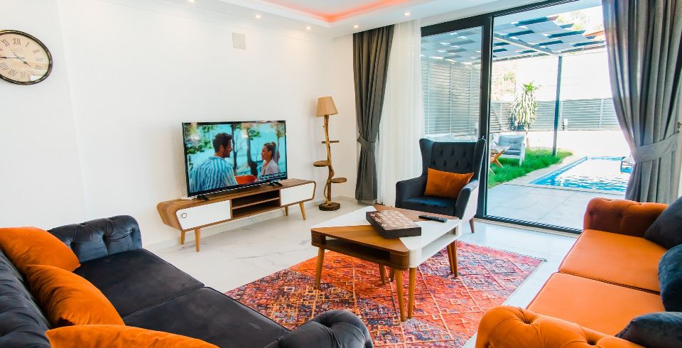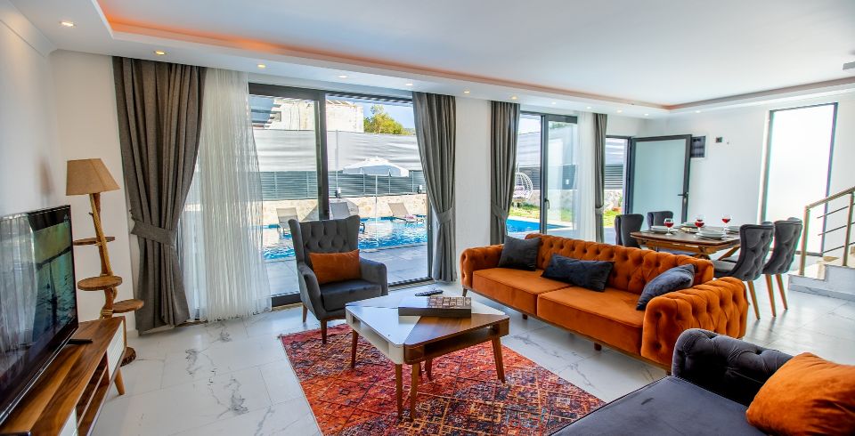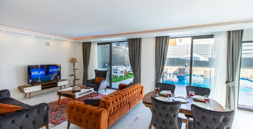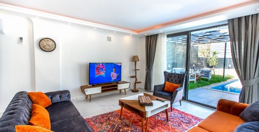 Salon : Villa konforlu oturma grubu, klima, televizyon, internet, uydu alıcı, yemek masası, sehpa bulunmaktadır.