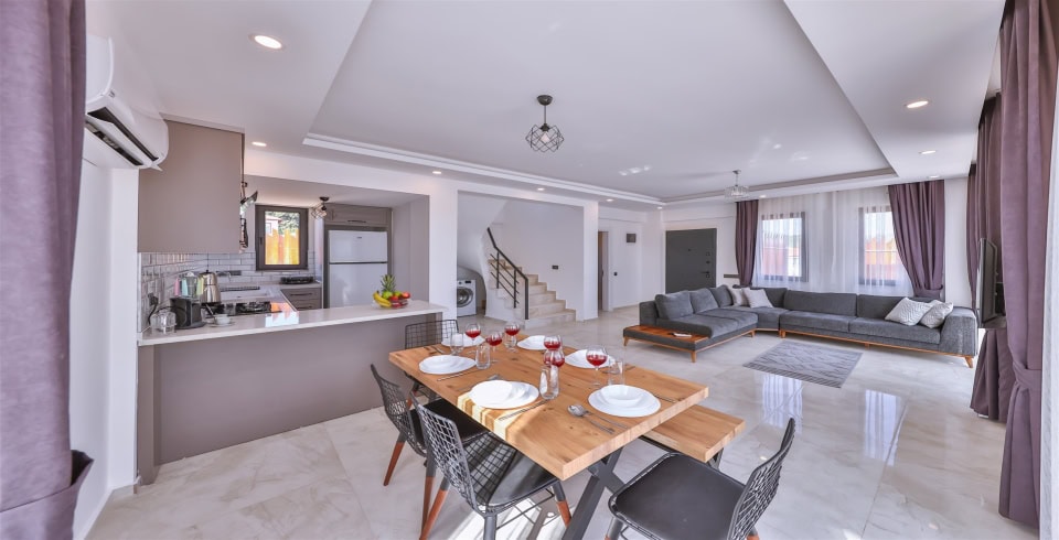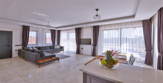 Salon : Villamızın iç dizaynı da son derece modern bir şekilde tasarlanmıştır. Çeşitli dekoratif eşyalarla süslediğimiz salonumuz havuzlu bahçeye açılıyor. Oturma grubu, tv, internet, klima, yemek masası bulunmaktadır.