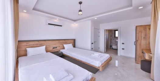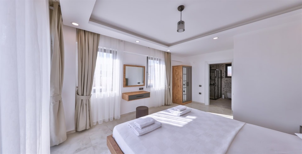 1. Yatak Odası : Doğa ile iç içe olan villamızın yatak odası manzarasında da sizi sonsuz güzel yeşillikler karşılayacak. Beraberinde çift kişilik yatak, klima, komodin, banyo ve lavabo bulunmaktadır.