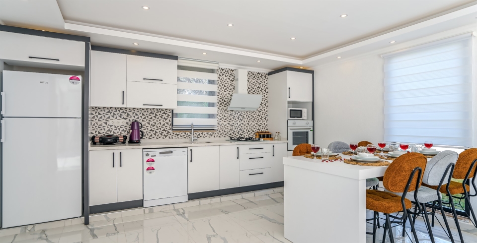 Mutfak : Villa Modern Amerikan mutfak 4 kişilik yemek takımı, buzdolabı, çamaşır makinesi,4'lü ocak, tost makinası, kettle, çatal bıçak takımı, tencere tava takımı, bulaşık makinesi bulunmaktadır.