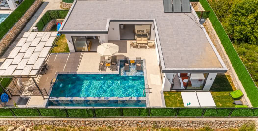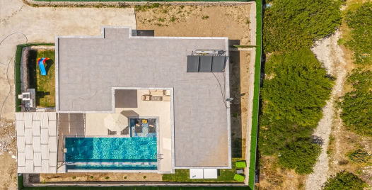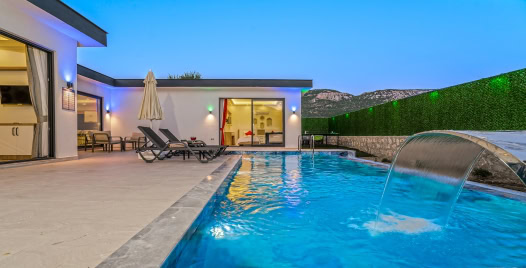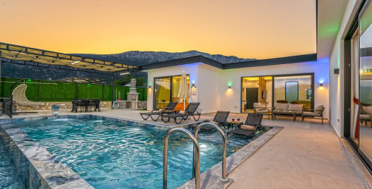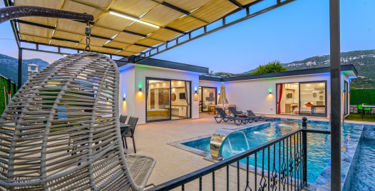 Villanın havuz terası muhafazakar olup dışarıdan görünmemektedir; bu özelliğiyle özellikle gizliliğe önem veren misafirlerimiz için uygundur. Geniş iç mekanı, hamam, sauna ve jakuzi gibi lüks olanaklarıyla yılın tüm yorgunluğunu atmanızı sağlar.