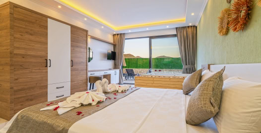 1. Yatak Odası : 1 adet çift kişilik yatak, TV, klima, komodin, makyaj masası, elbise dolabı, jakuzi ve banyo tuvalet bulunmaktadır.