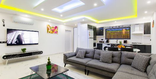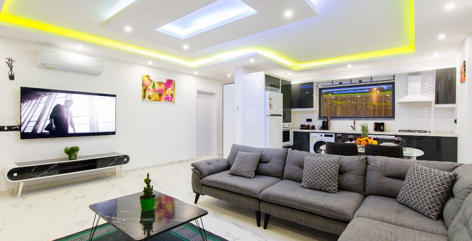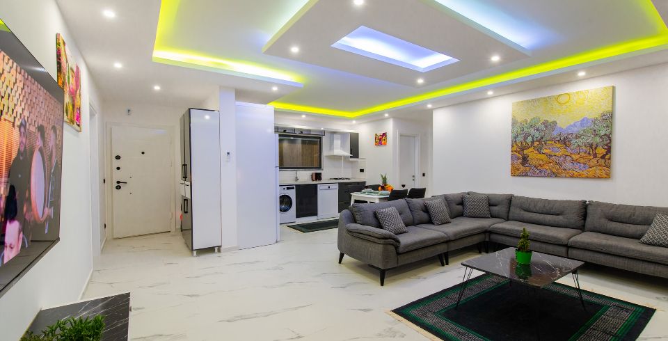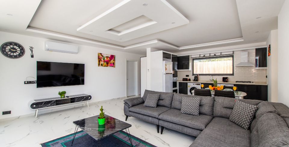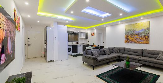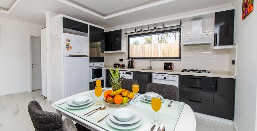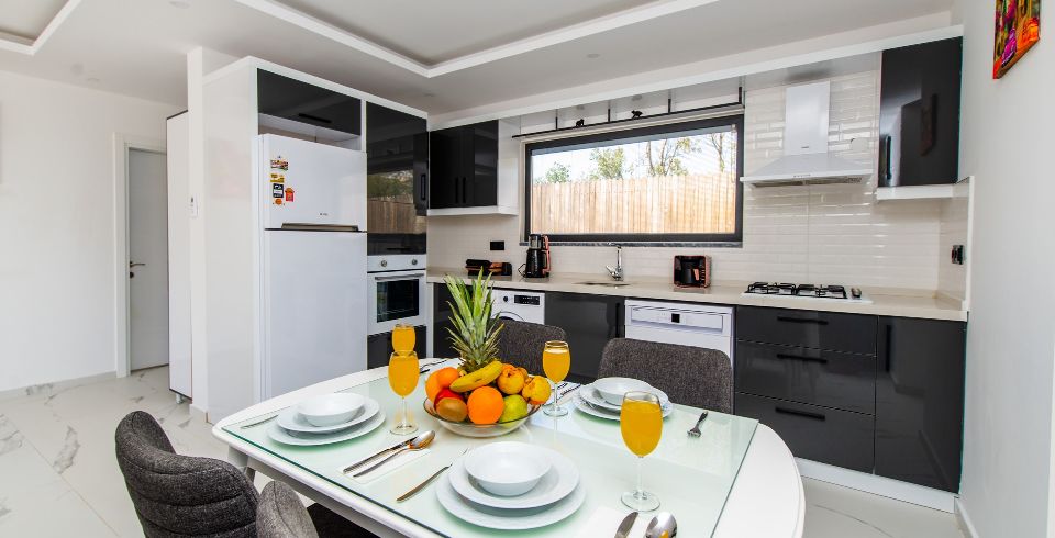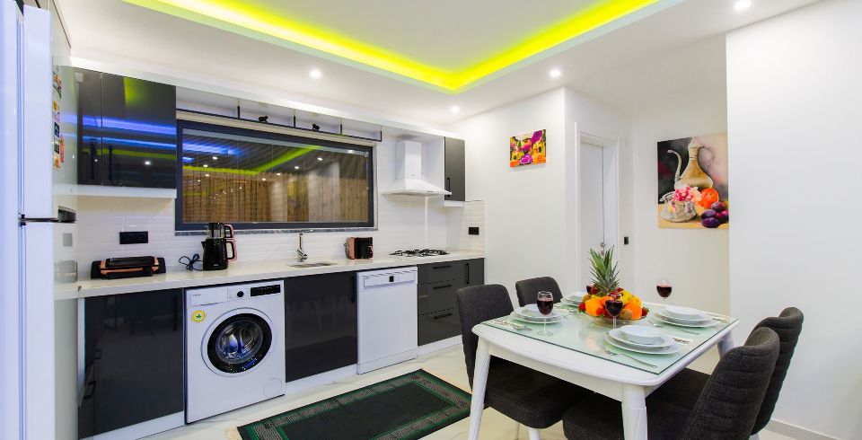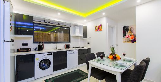 Mutfak : Amerikan açık mutfak, bulaşık makinası, buzdolabı, çamaşır makinası, su ısıtıcısı, fırın, 4'lü ocak seti, yemek masası ve mutfak araç gerekleri 4 kişilik olarak mevcuttur.
