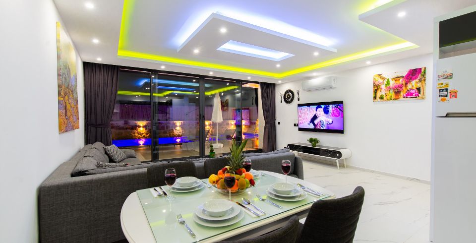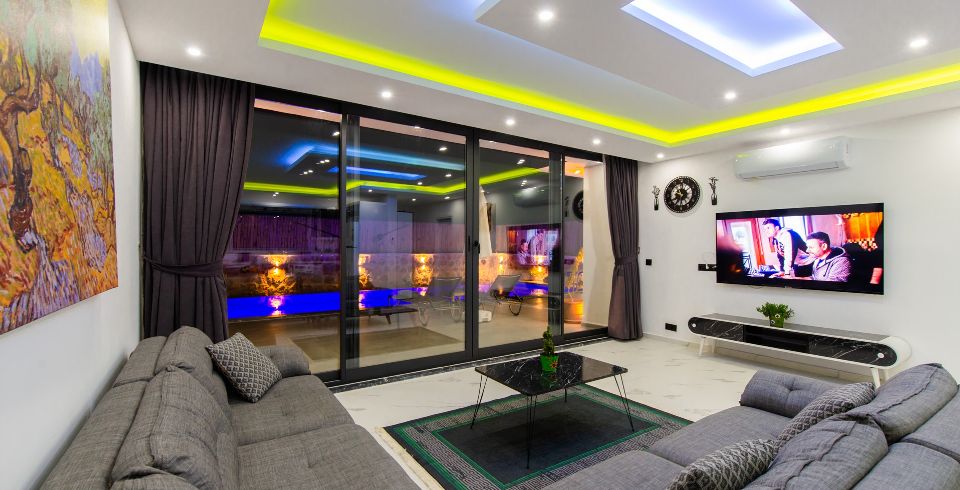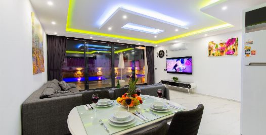 Salon : Villamızın salonu havuz başına çıkışlı olup salonumuzda oturma grubu, TV, internet, uydu, koltuk, sehpa bulunmaktadır.