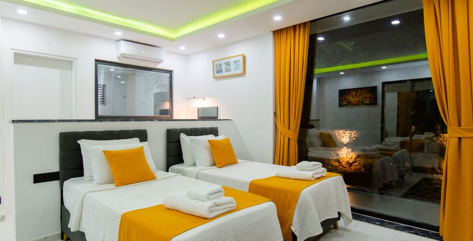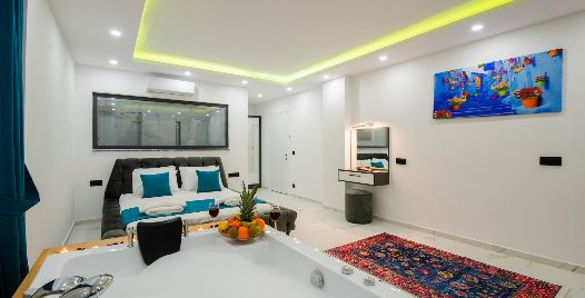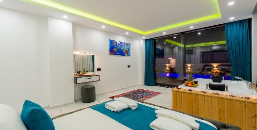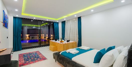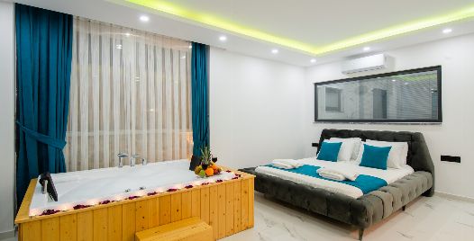 1. Yatak Odası : Çift kişilik yatak, klima, komodin, elbise dolabı, makyaj masası, banyo ve lavabo, jakuzi bulunmaktadır.