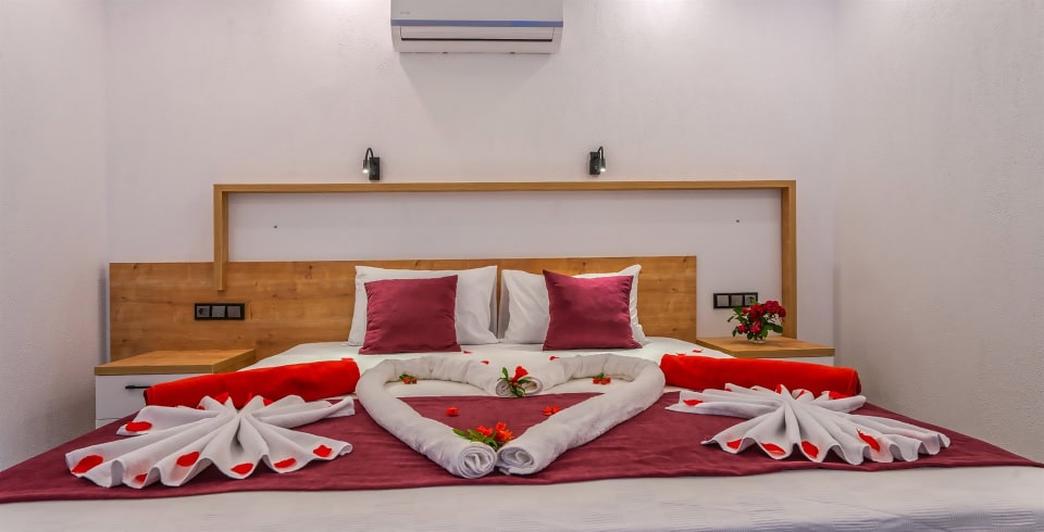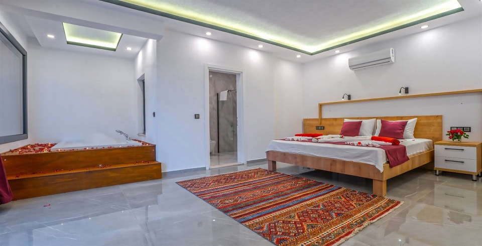 1. Yatak Odası : Çift kişilik yatak, elbise dolabı, jakuzi, klima, komodin, makyaj masası, banyo ve tuvalet bulunmaktadır.