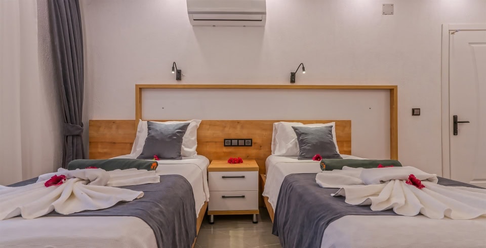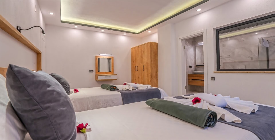 2. Yatak Odası : 2 adet tek kişilik yatak, elbise dolabı, klima, komodin, makyaj masası, tuvalet ve banyo bulunmaktadır.