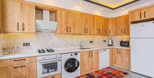Mutfak : Modern Amerika mutfağımızda yemek masası, buzdolabı, çamaşır makinesi, 4’lü ocak, elektrikli su ısıtıcısı, çatal-bıçak takımı, tencere-tava takımı, bulaşık makinesi bulunmaktadır.