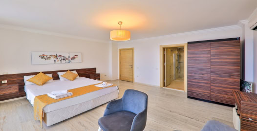 3. Yatak Odası : Çift kişilik yatak, klima, makyaj masası, komodin, elbise dolabı, banyo ve tuvalet bulunmaktadır.