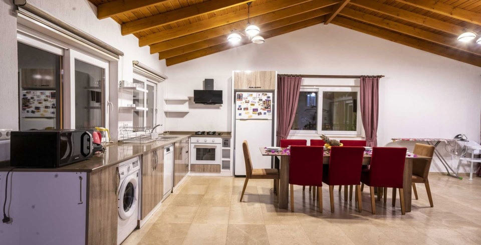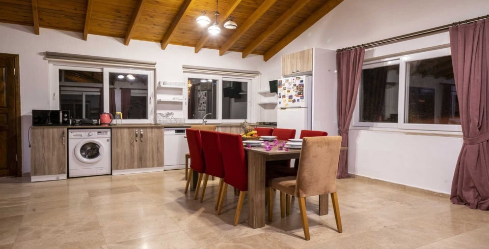 Salon : Ferah ve şık dizayn edilmiş Amerikan Mutfak , Buzdolabı , Bulaşık Makinesi , Çamaşır Makinesi , Fırın , Ocak , Mikrodalga Fırın , Elektrikli Su Isıtıcısı , Tost Makinesi , Tava Tencere vb. Mutfak Ekipmanları