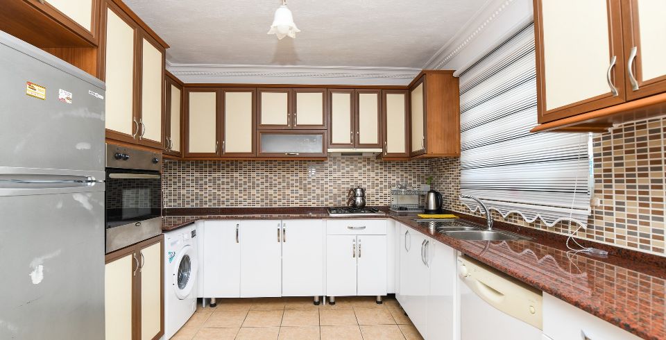 Mutfak : Modern Amerikan mutfak, buzdolabı, bulaşık makinası, çamaşır makinası, ankastre fırın, mikrodalga fırın, ankastre 4’lü ocak, elektrikli su ısıtıcısı, ekmek kızartma makinası, 10 kişilik yemek takımı, tava, tencereler, çatal, bıçak vs.
