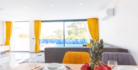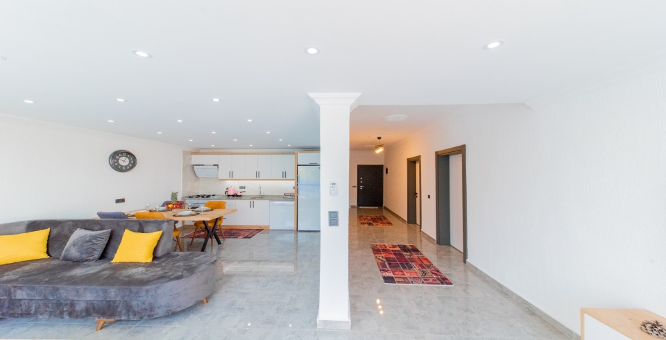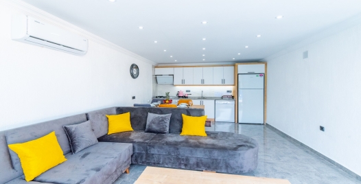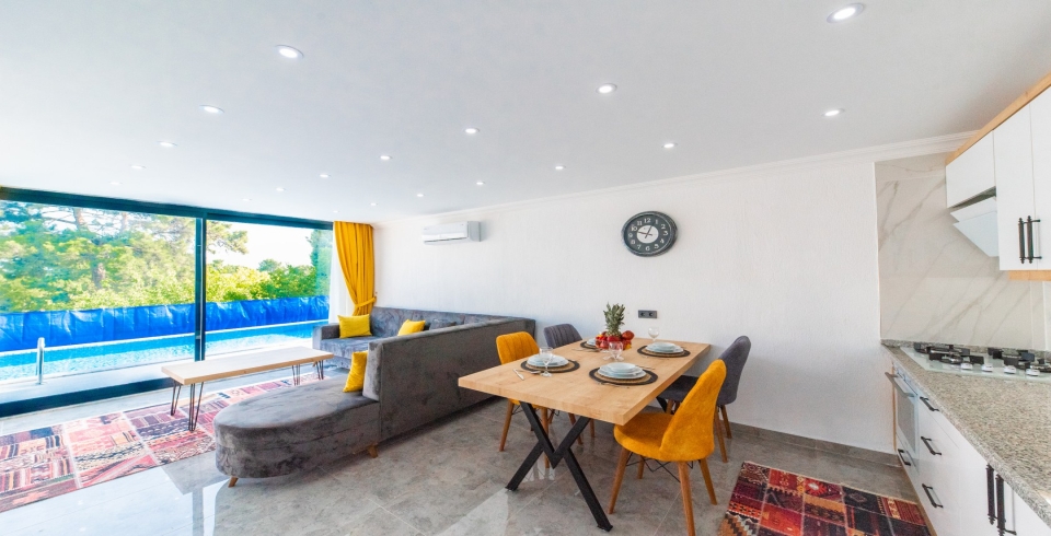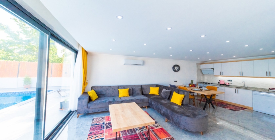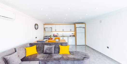 Salon: Özenle döşenmiş salon, modern koltuklar, 4 kişilik yemek masası, LCD TV ve klima bulunmaktadır.