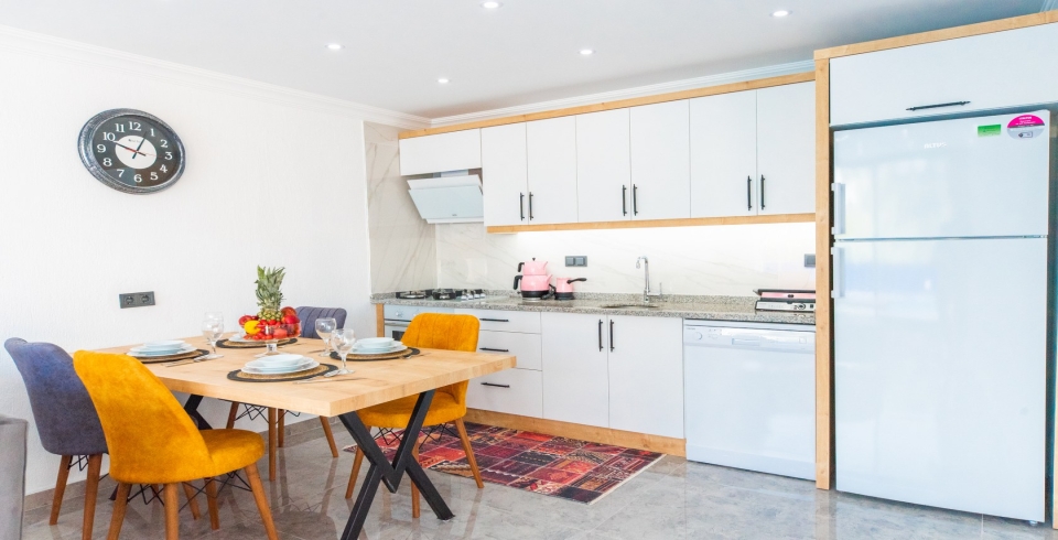 Mutfak: Açık planlı mutfak, 4 kişiye yetecek kadar mutfak malzemeleri, buzdolabı, fırın, ocak, mikrodalga fırın, bulaşık makinesi, çamaşır makinesi, tost makinesi, kettle ve çaydanlık bulunmaktadır..
