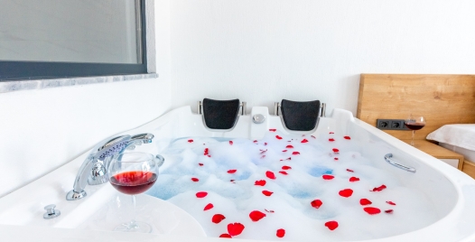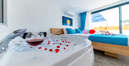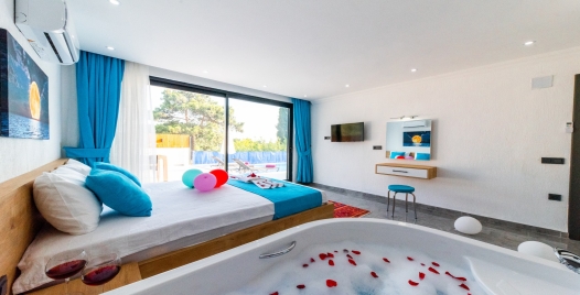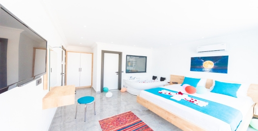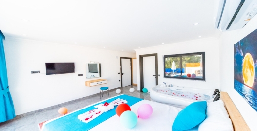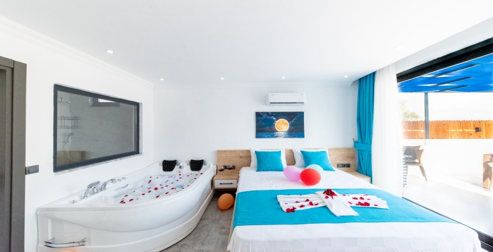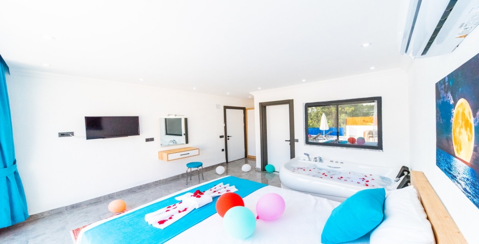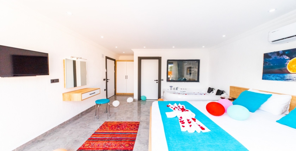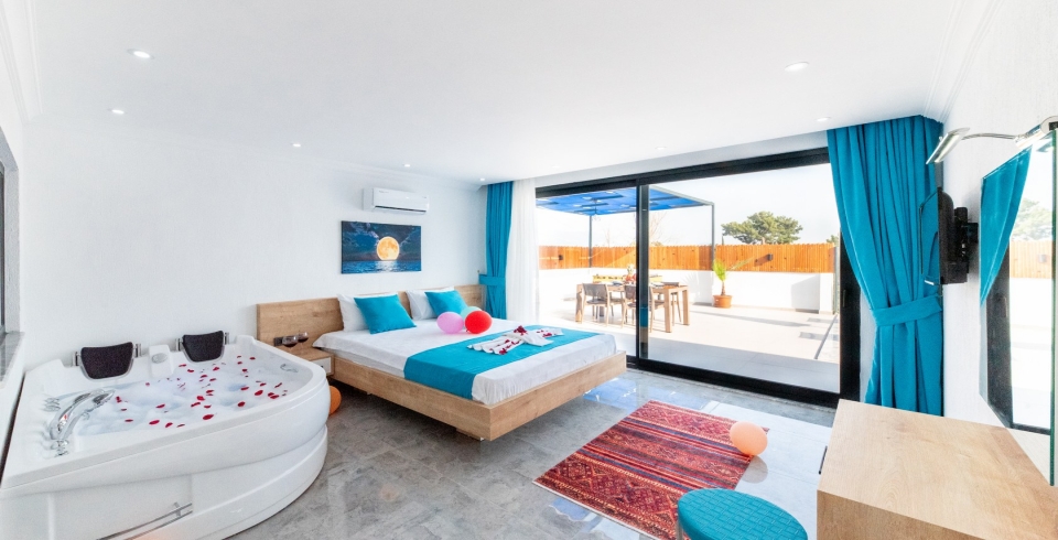 1.Yatak Odası: 1 adet çift kişilik yatak, elbise dolabı, komodin, klima, makyaj masası, TV, jakuzi, banyo ve lavabo bulunmaktadır.