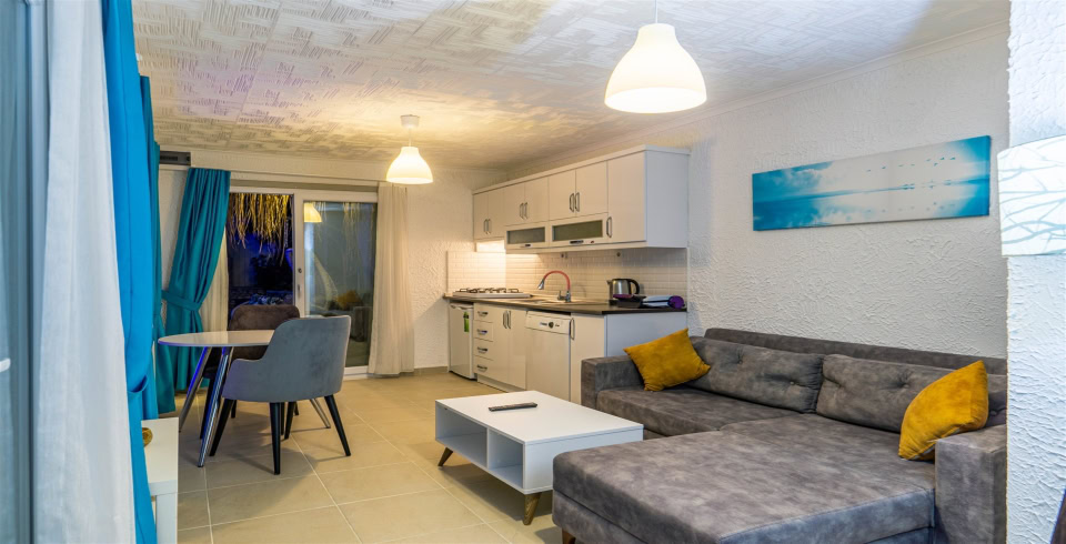 Salon : Havuz terasına direkt çıkışı olan salonumuzda televizyon, modem, oturma grubu, klima, sehpa bulunmaktadır.