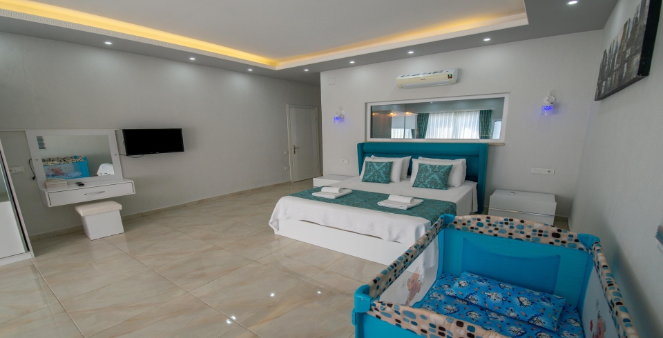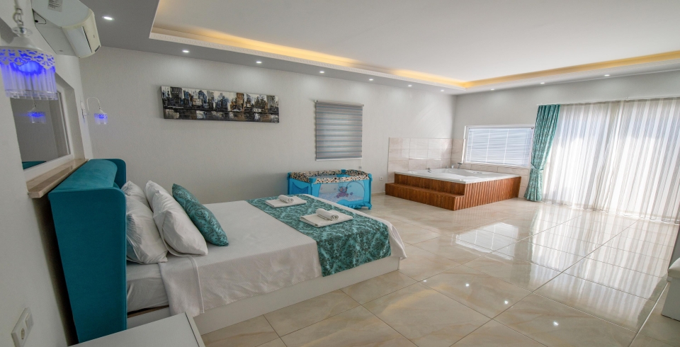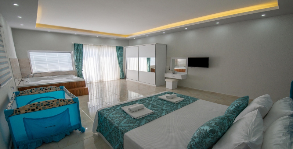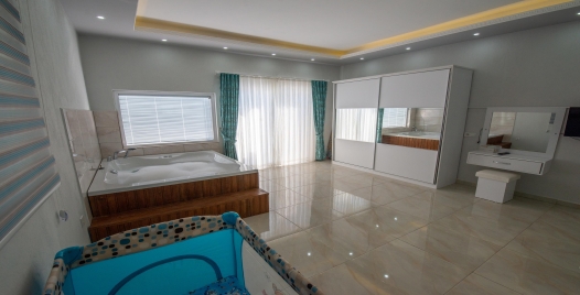 1. Yatak Odası: 1 adet çift kişilik yatak, elbise dolabı, jakuzi, makyaj masası, klima, komodin, makyaj masası, banyo ve lavabo bulunmaktadır.