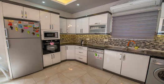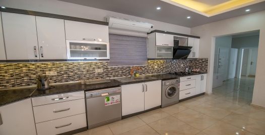 Mutfak: Amerikan mutfak, bulaşık makinası, buzdolabı, ankastre fırın, ankastre 4’lü ocak, su ısıtıcısı, tencere ve tava takımı, yemek takımı, kaşık çatal bıçak takımı, bardak takımı, yemek masası, sandalyeler, tost makinesi, çamaşır makinesi. bulunmaktadır.