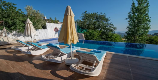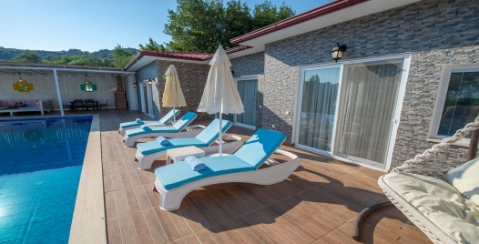 Havuz ve Bahçe: Bahçe içerisinde korunaklı özel yüzme havuzu, şezlong , yemek masası ve sandalyeler, bahçe oturma grubu, salıncak ve barbekü yer almaktadır.