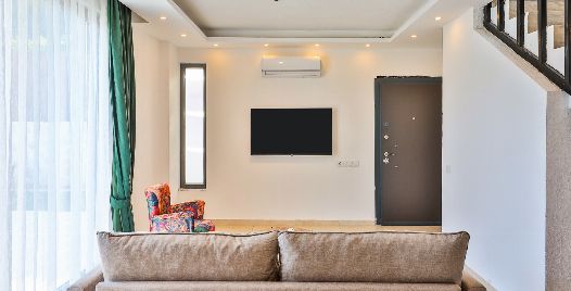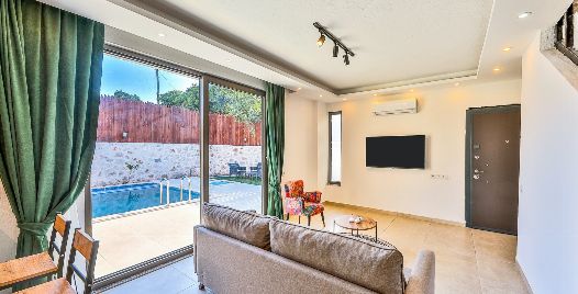 Salon: Villa salonunda konforlu oturma grubu, klima, TV, internet, uydu alıcı, yemek masası, sehpa bulunmaktadır.