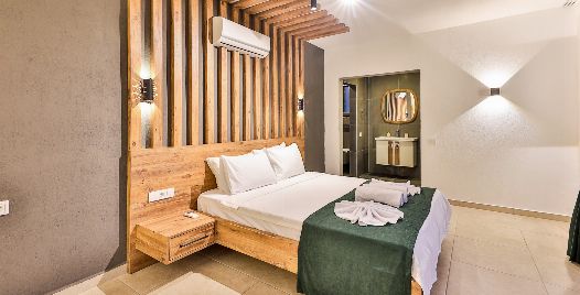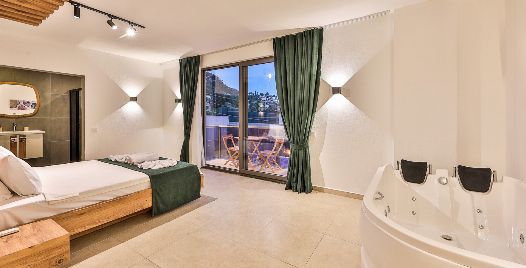 1. Yatak Odası: Çift kişilik yatak, klima, jakuzi, komodin, elbise dolabı, makyaj masası, banyo ve tuvalet bulunmaktadır.