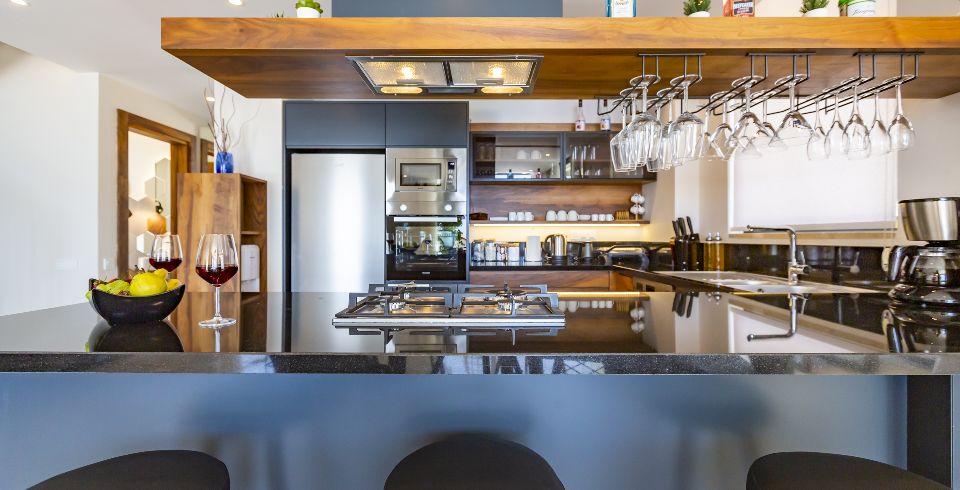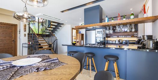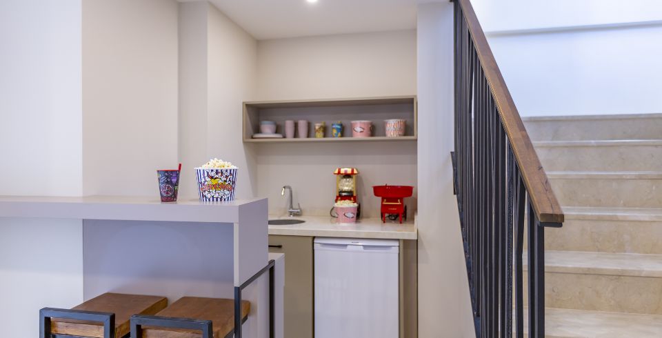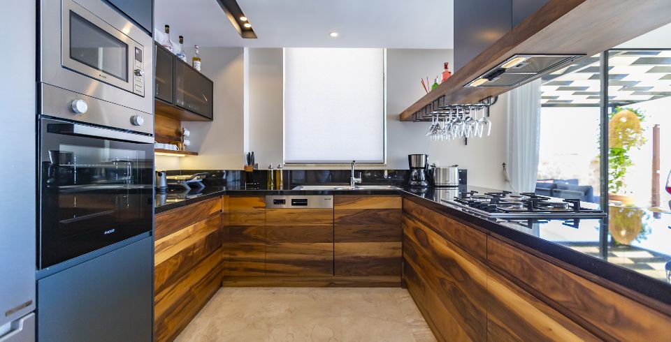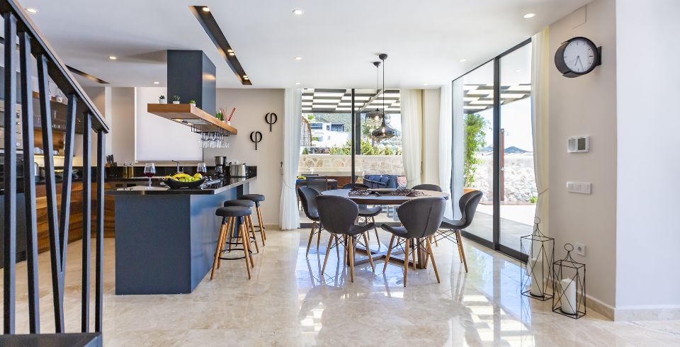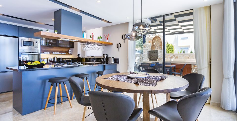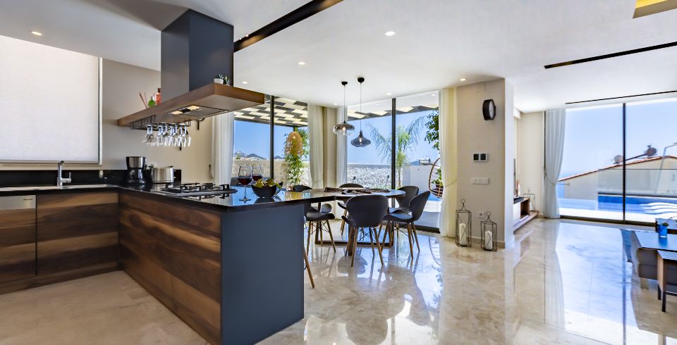 Mutfak : Villamız içinde modern Amerikan mutfak bulunmaktadır. Mutfakta mikrodalga fırın, bulaşık makinası, ankastre fırın, buzdolabı, çamaşır makinası, ankastre 4’lü ocak, elektrikli su ısıtıcı kettle, ekmek kızartma makinası, tencere ve tava takımı, 6 kişilik yemek takımı, kaşık ve çatal seti ve bardaklar bulunmaktadır. Havuz başına geçiş bulunmaktadır.
