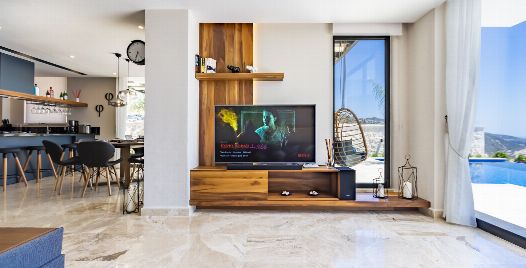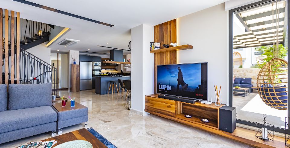 Salon : Salonda klima uydu alıcı, TV, DVD Player, oturma grubu, çocuk yatağı, çocuk koltuğu, lavabo yer almaktadır. Salon havuz katındadır. En üst katta dinlenmek ve güneşlenmek için çok geniş bir seyir terası daha vardır. Bu alanda da oturma gurubu bulunur.