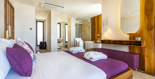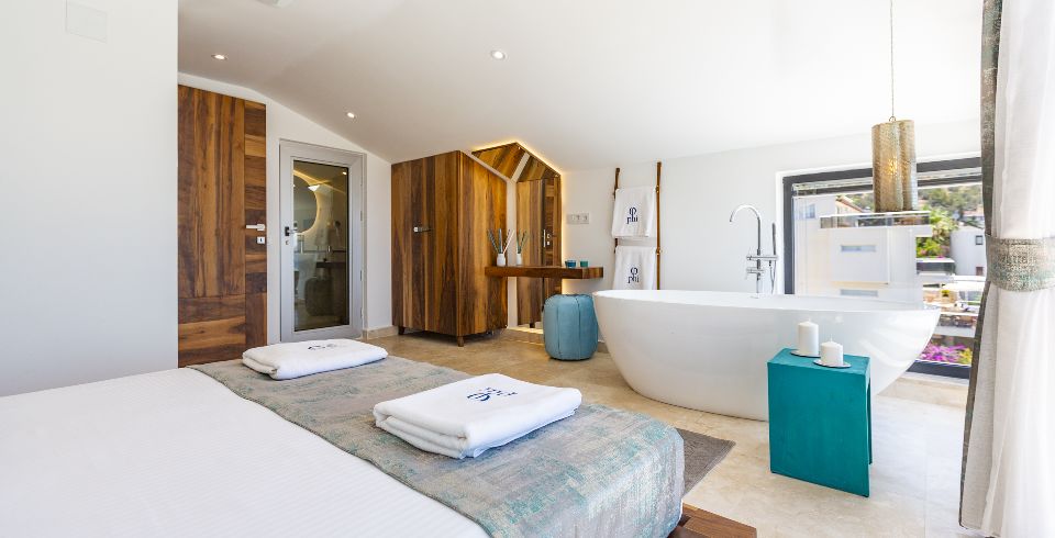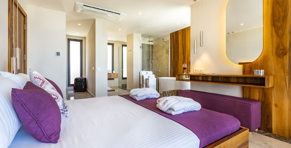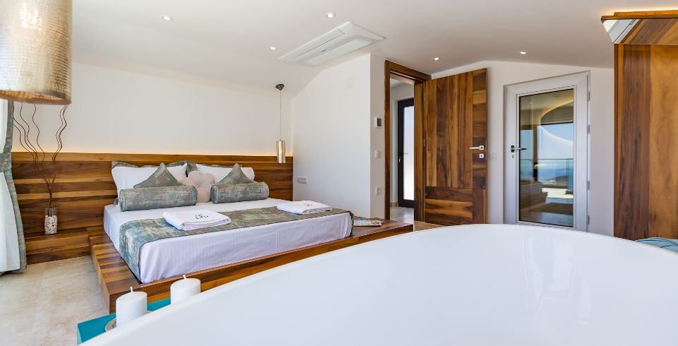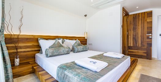 1. Yatak Odası : Süit yatak odası çift kişilik konfor yatak, klima, gardırop, komodin, jakuzi ve banyo-WC yer almaktadır.
