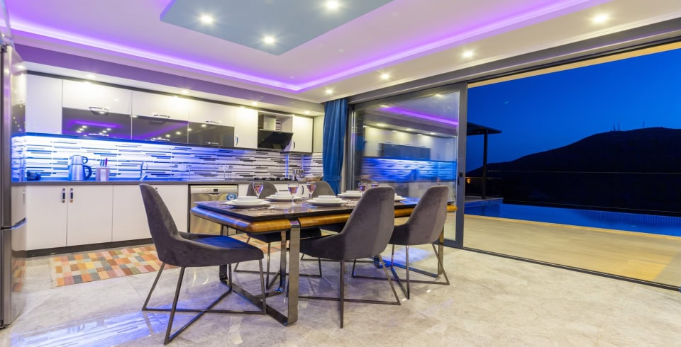 Mutfak : Villamızın geniş Amerikan mutfağı ile sizlere kendi evinizin mutfağı gibi hissettirecek. Ayrıca mutfakta klima, bulaşık makinası, buzdolabı, çamaşır makinası, mikrodalga fırın, tost makinası, ekmek kızartma, su ısıtıcısı, fırın, 4`lü ocak seti ve 6 kişilik geniş yemek masası ile tava tencere vb. mutfak araç gereçlerini kullanma fırsatını sizlere sunuyoruz.