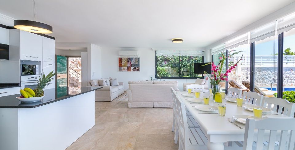 Açık plan salon ve mutfak bölümü zemin katta yer alır. Geniş cam sürgülü kapılar sayesinde iç mekândan havuz terasına doğrudan geçiş sağlanır. Salon kısmında konforlu oturma grupları, TV ve iklimlendirme sistemi bulunurken, mutfak kısmı fırın, ocak, buzdolabı, bulaşık makinesi ve gerekli mutfak araç-gereçleriyle donatılmıştır.
