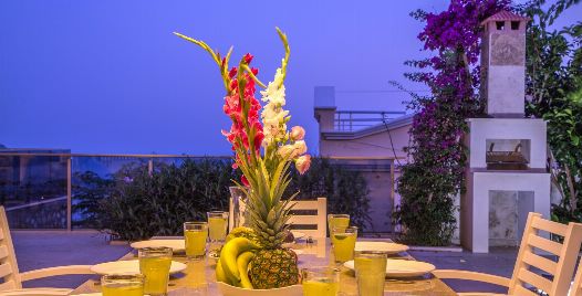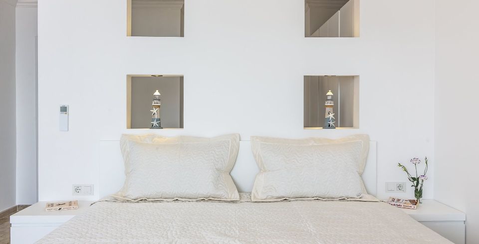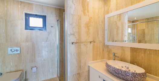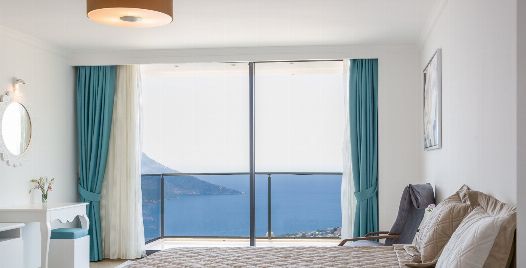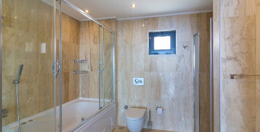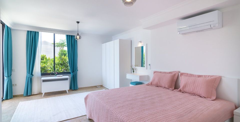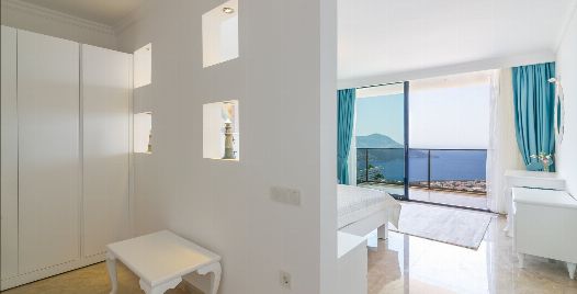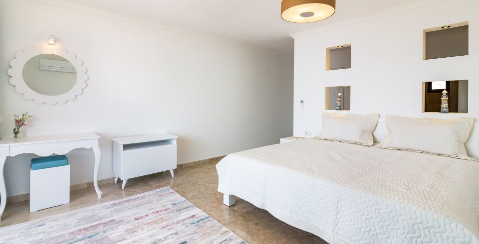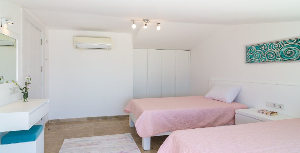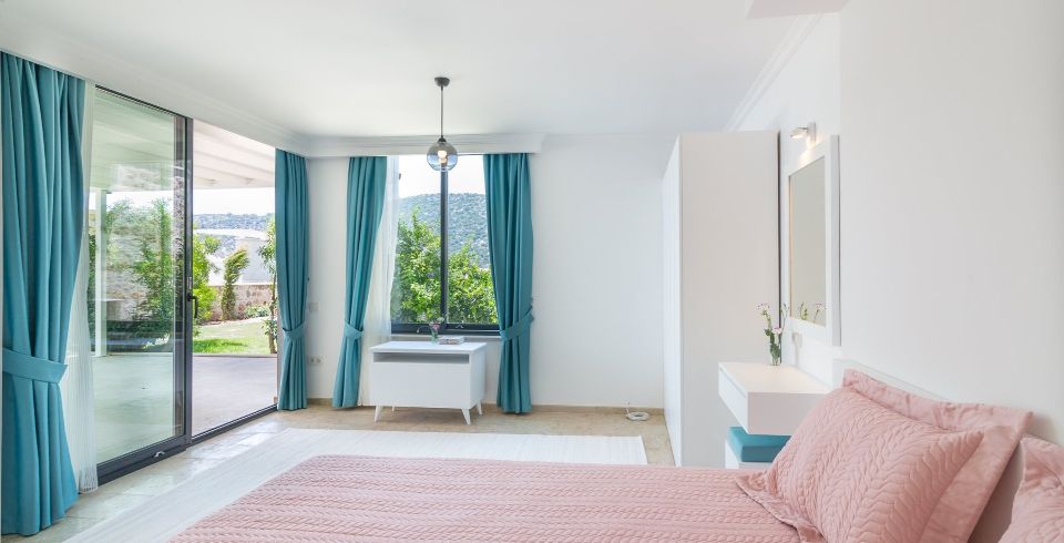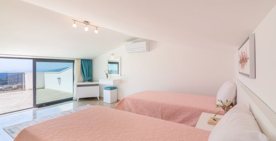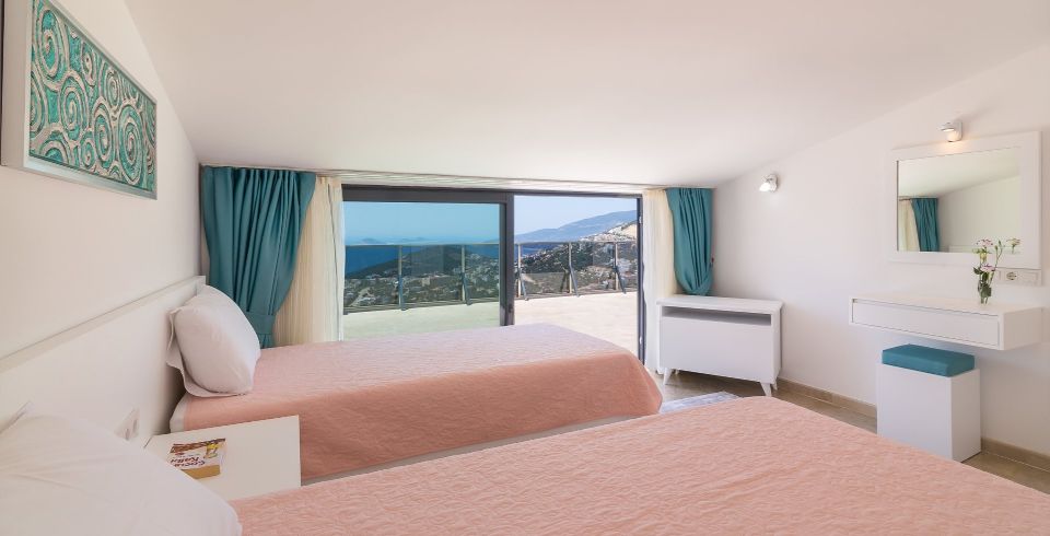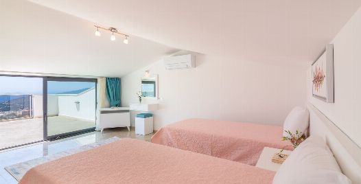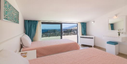 Villada her biri ebeveyn banyolu odalar yer alır; bazı odalarda balkon ve deniz manzarası mevcuttur. Özellikle bir odada jakuzi bulunması, konfor seviyesini artırmaktadır. Üst kattaki iki oda, çatı terasına doğrudan erişim imkânı sunar.