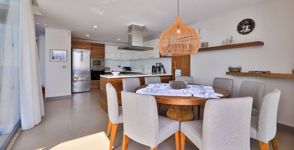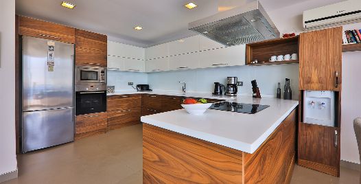 Mutfak : Amerikan mutfak bulunmaktadır. Mutfakta mikrodalga fırın, bulaşık makinası, ankastre fırın, buzdolabı, çamaşır makinası, ankastre 4’lü ocak, elektrikli su ısıtıcı kettle, ekmek kızartma makinası, tencere ve tava takımı, 8 kişilik yemek takımı, kaşık ve çatal seti ve bardaklar bulunmaktadır. Mutfak havuz katındadır.
