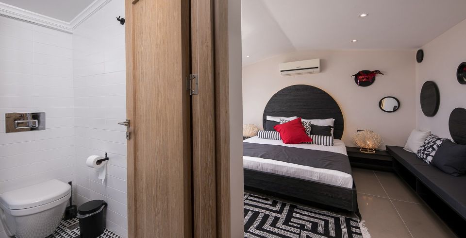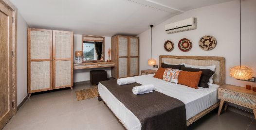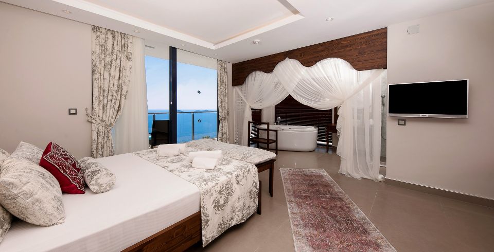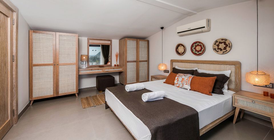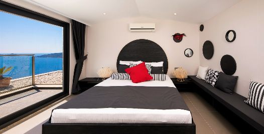 1. Yatak Odası : Master süit yatak odası klimalıdır. Oda içerisinde 1 adet çift kişilik yatak, gardırop, komodin, LCD TV, berjer, Jakuzi banyo-WC ve balkon yer almaktadır.