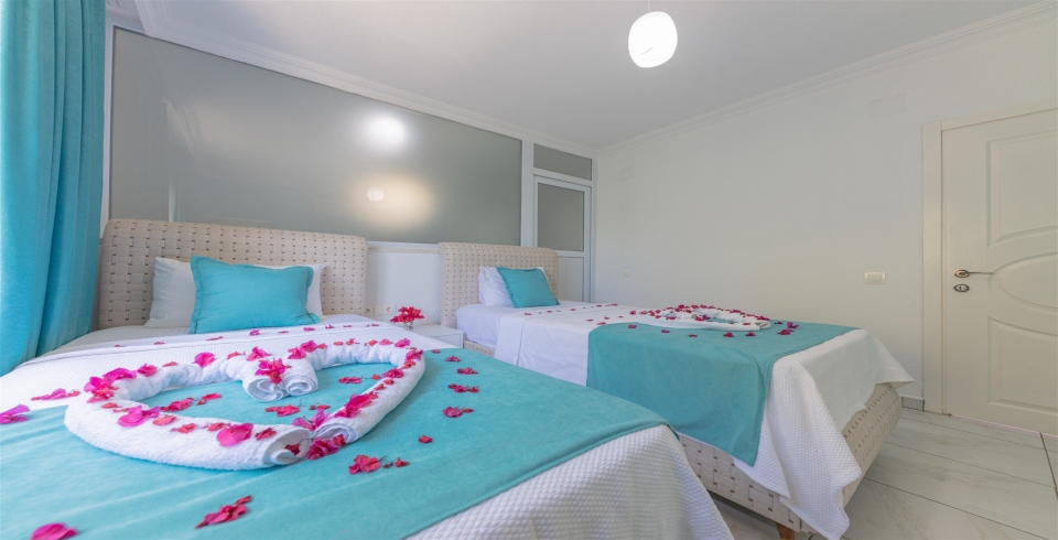 2. Yatak Odası: 2 adet tek kişilik yatak klima, komodin, elbise dolabı, makyaj masası, banyo ve tuvalet bulunmaktadır.