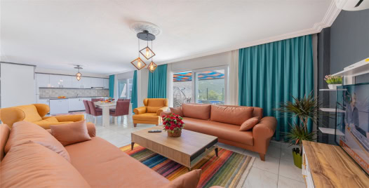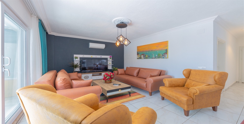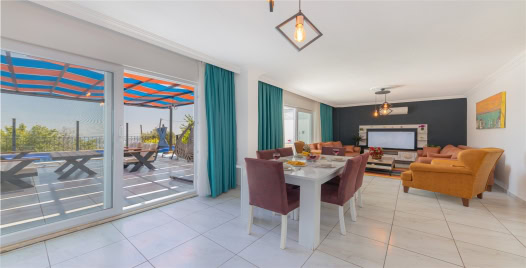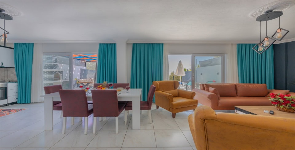 Salon: Villa salonunda konforlu oturma grubu, klima, TV, internet, uydu alıcı, yemek masası, sehpa bulunmaktadır.