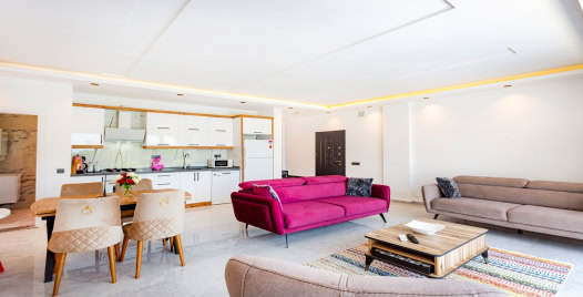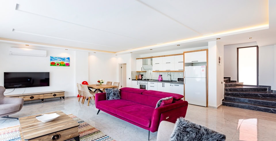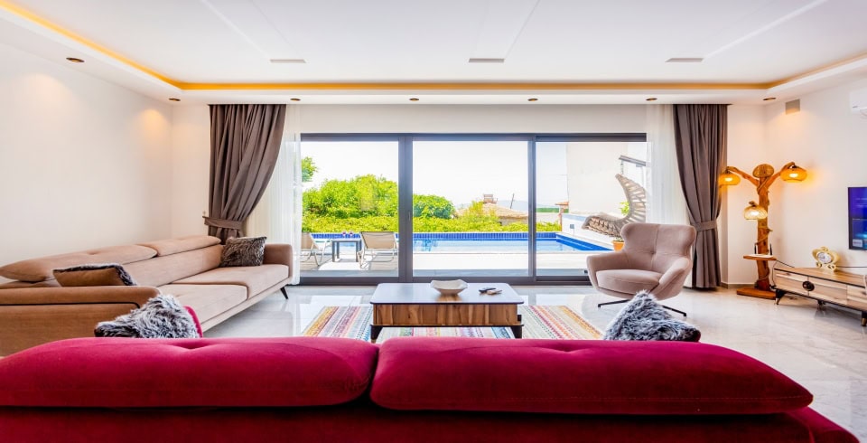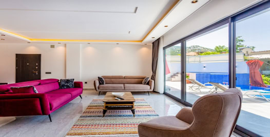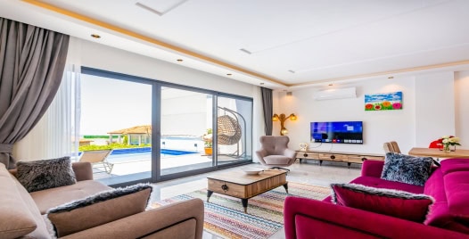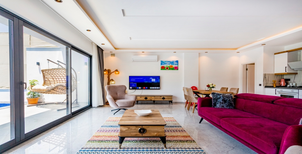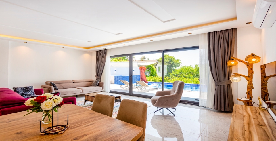 Salon : Salon içerisinde oturma grubu, TV, klima, sehpa bulunmaktadır. Havuz terasına çıkış yapılabilmektedir.