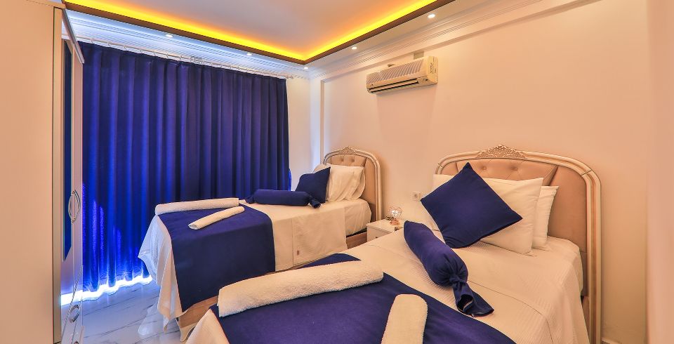 2. Yatak Odası : 2 adet tek kişilik yatak, komodin, klima, makyaj masası, elbise dolabı, banyo ve tuvalet bulunmaktadır.
