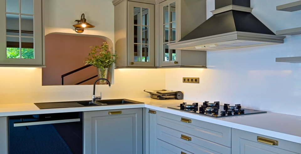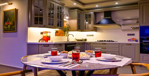 Mutfak: Açık planlı mutfak, 6 kişiye yetecek kadar mutfak malzemeleri, buzdolabı, fırın, ocak, mikrodalga fırın, bulaşık makinesi, çamaşır makinesi, tost makinesi, kettle ve çaydanlık bulunmaktadır..