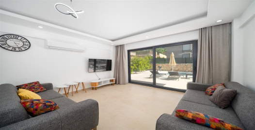 Salon : Kiralık villamızın salonunda oturma grubu, TV, uydu, internet, DVD, sehpa bulunmaktadır.