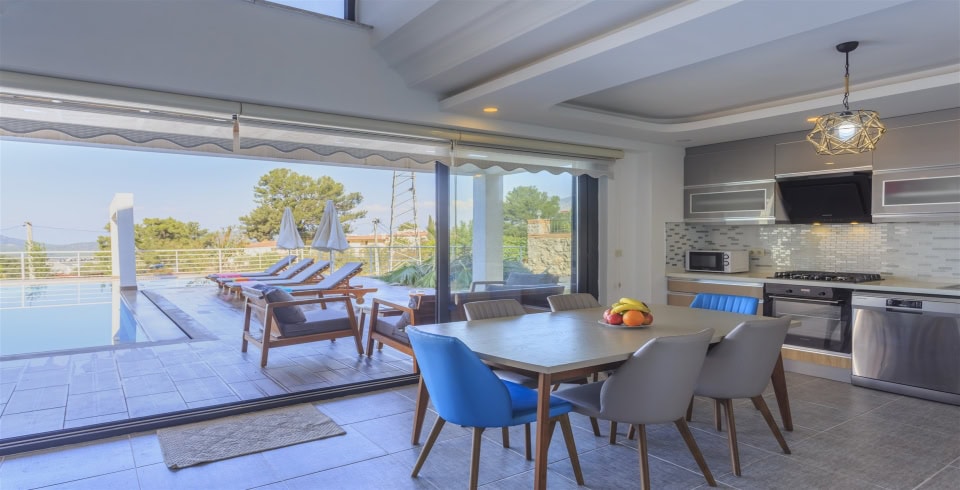Mutfak: Açık planlı mutfak, 8 kişi ve daha fazla kişiye yetecek kadar mutfak malzemeleri, buzdolabı, fırın, ocak, mikrodalga fırın, bulaşık makinesi, çamaşır makinesi, tost makinesi, kettle ve çaydanlık bulunmaktadır..