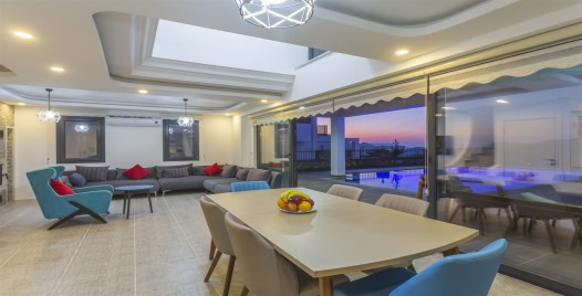 Salon: Özenle döşenmiş salon, modern koltuklar, yemek masası, LCD TV ve klima bulunmaktadır.