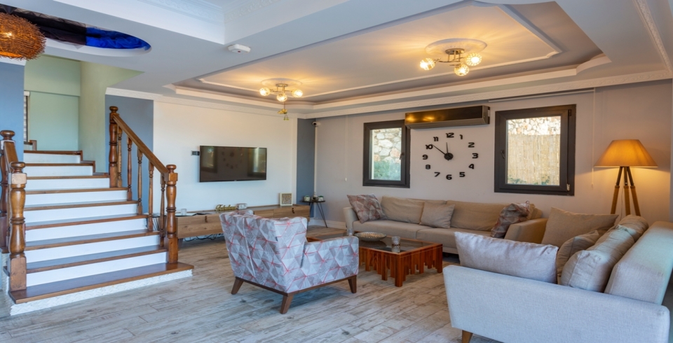 Salon: Özenle döşenmiş salon, modern koltuklar, yemek masası, LCD TV ve klima bulunmaktadır.