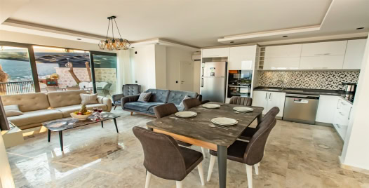 Mutfak :Tam donanımlı modern Amerikan mutfak içerisinde buzdolabı, bulaşık makinesi, fırın, ocak, tost makinası elektrikli su ısıtıcı, yemek masası, yemek takımları, çatal ve bıçak takımları, tencere ve tava takımları ve bardaklar bulunmaktadır.