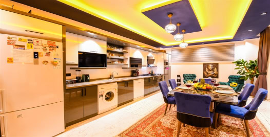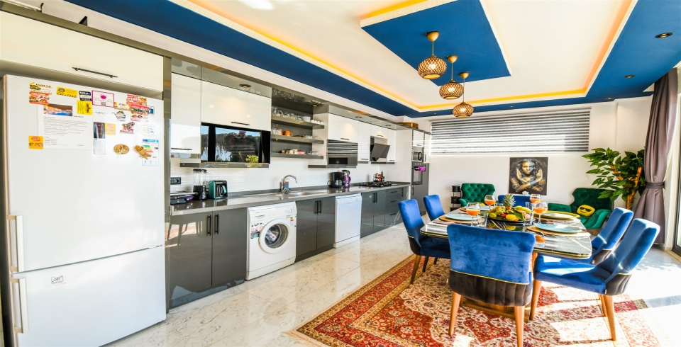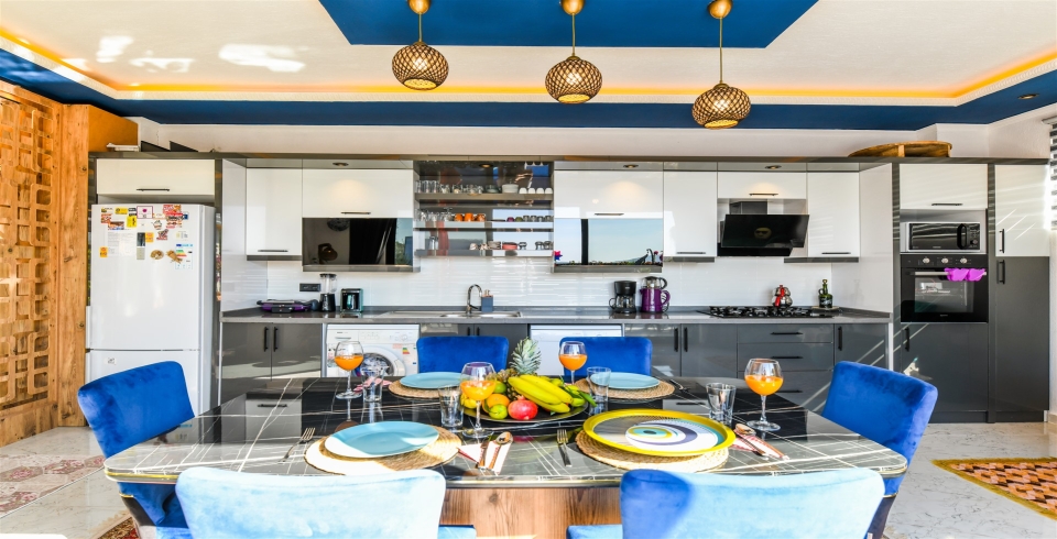 Mutfak : Villamızın geniş Amerikan mutfağı ile sizlere kendi evinizin mutfağı gibi hissettirecek. Ayrıca mutfakta klima, bulaşık makinası, buzdolabı, çamaşır makinası, mikrodalga fırın, tost makinası, ekmek kızartma, su ısıtıcısı, fırın, 4`lü ocak seti ve 6 kişilik geniş yemek masası ile tava tencere vb. mutfak araç gereçlerini kullanma fırsatını sizlere sunuyoruz.