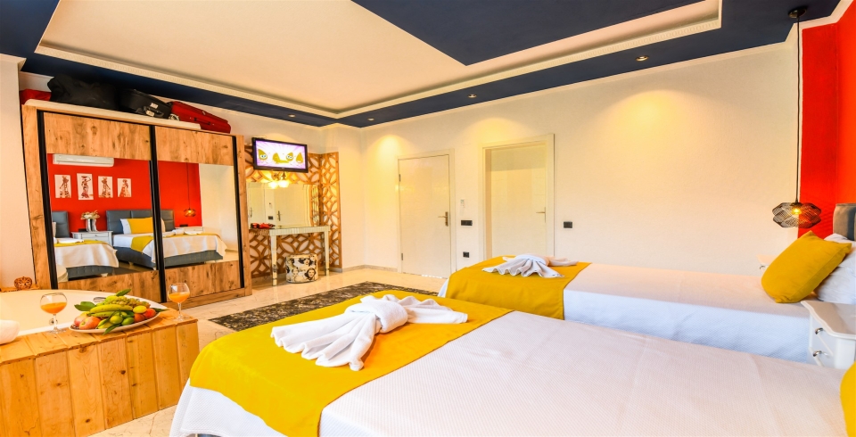 2. Yatak Odası : 2 adet tek kişilik yatak, televizyon, klima, jakuzi elbise dolabı, makyaj masası, komodin, banyo ve lavabo bulunmaktadır.